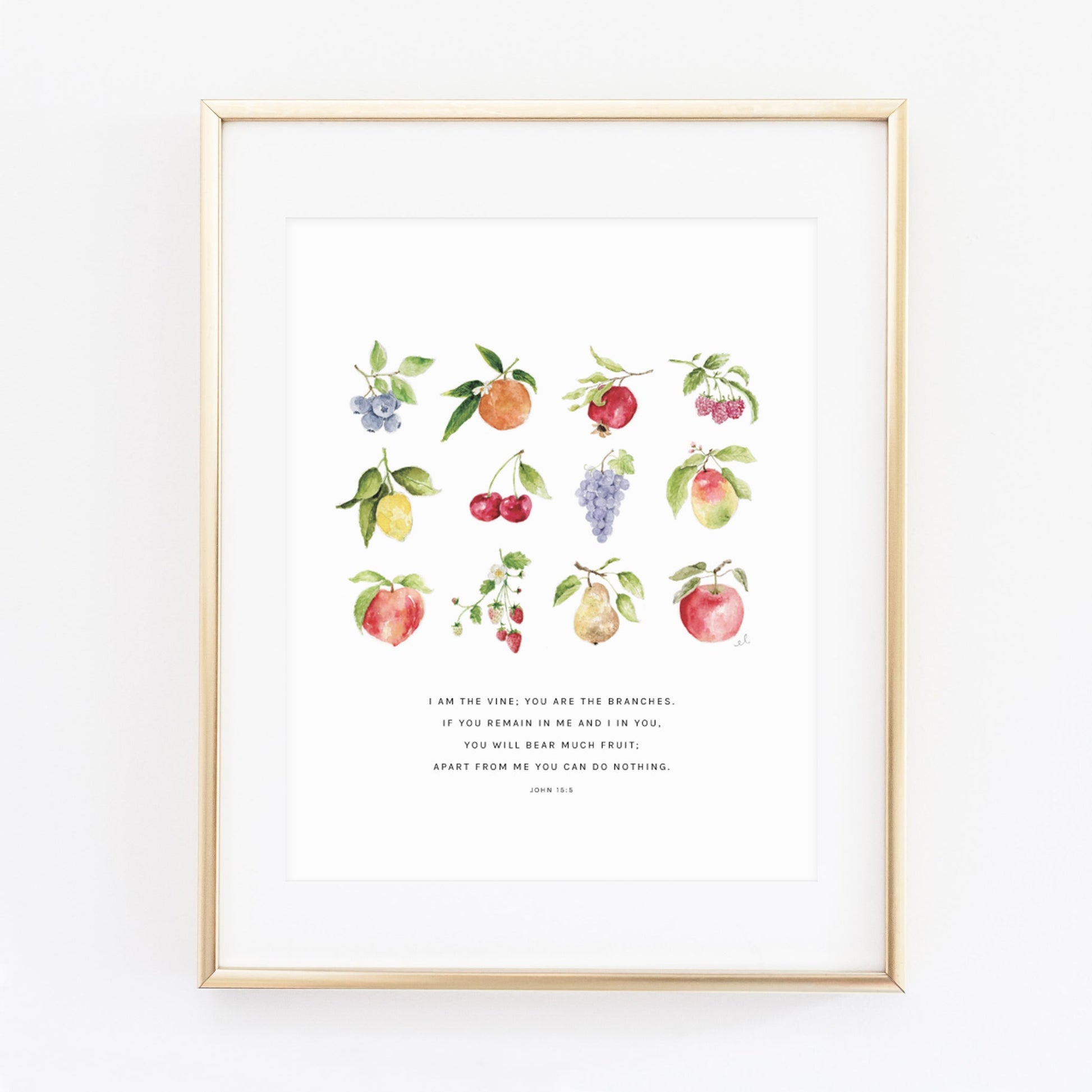 Fruit watercolor illustrations with John 15:5 "I am the vine; you are the branches. If you remain in me and I in you, you will bear much fruit; apart from me you can do nothing."