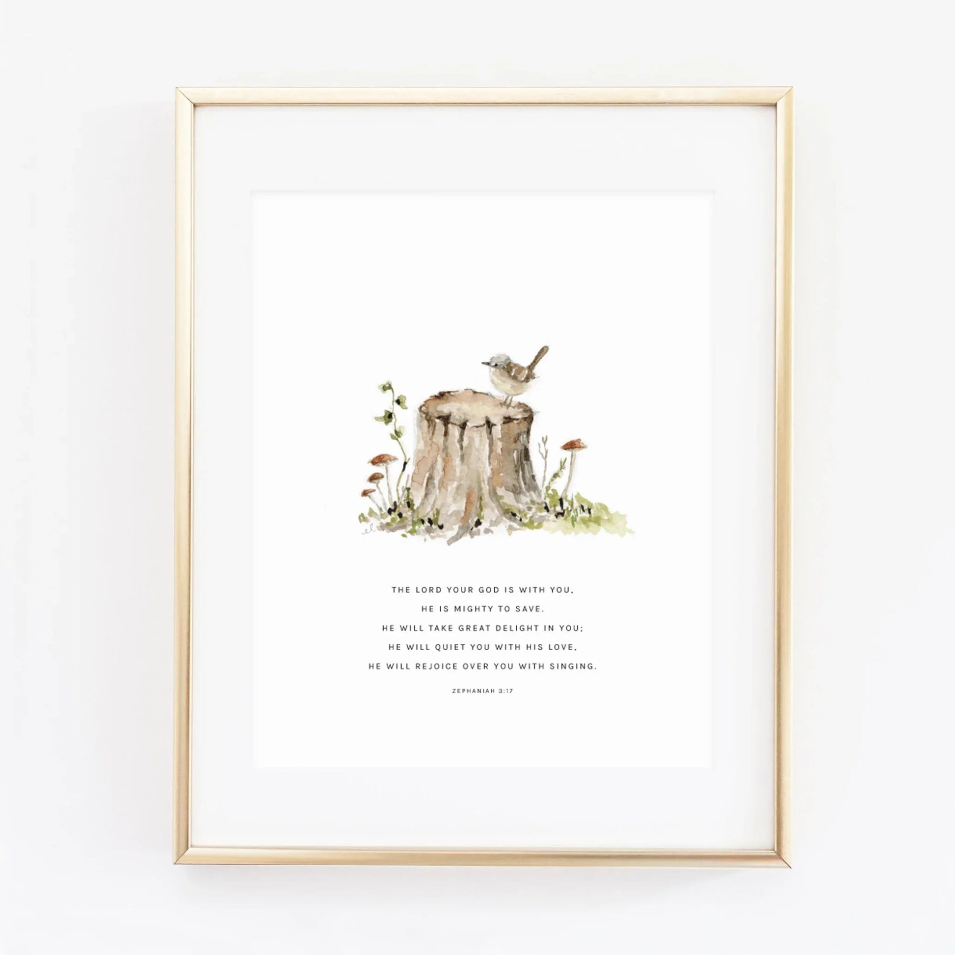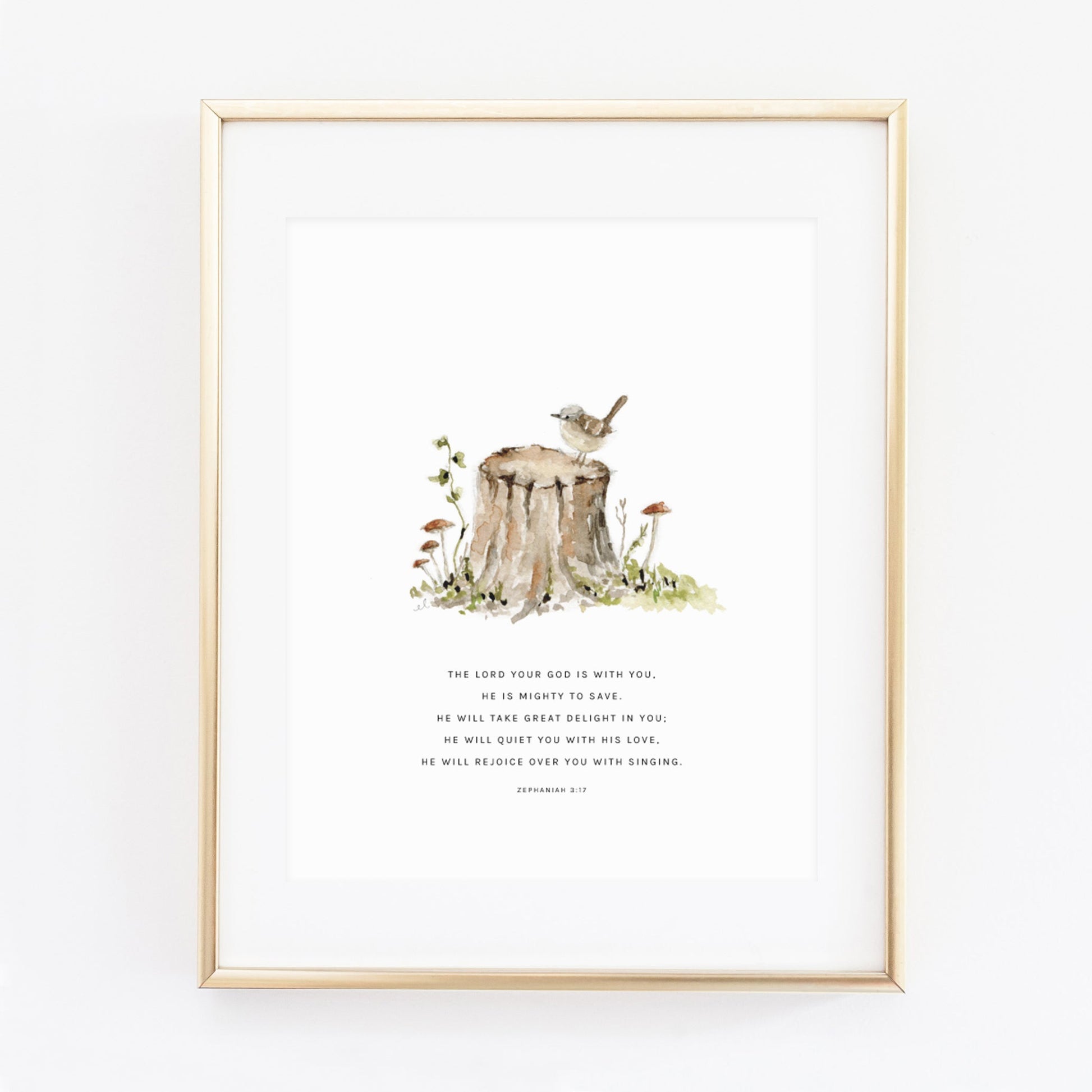 Tree stump watercolor illustration with Zephaniah 3:17 " The Lord your God is with you, He is mighty to save. He will take great delight in you; He will quiet you with His love, He will rejoice over you with singing."